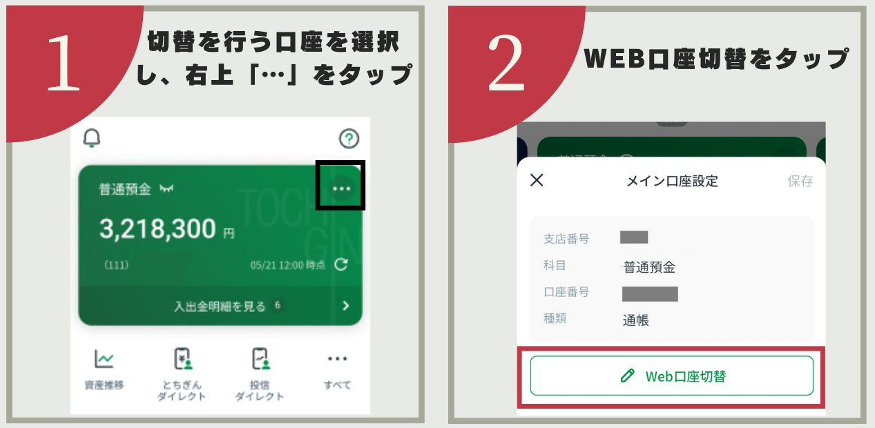 ・アプリからWEB口座の切替ができるのは、とちぎんアプリに登録したメイン口座のみです。サブ口座をWEB口座に 切替する場合は、窓口でのお手続きが必要です。