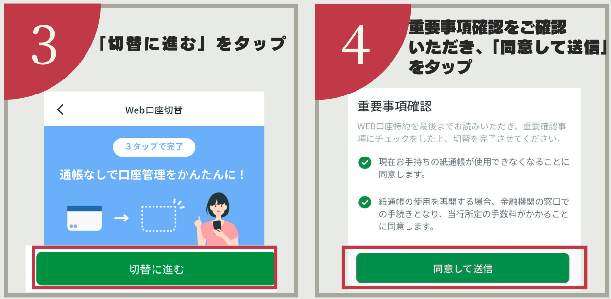 ・アプリからWEB口座切替申込操作実施後、紙通帳でのお取引ができなくなります。